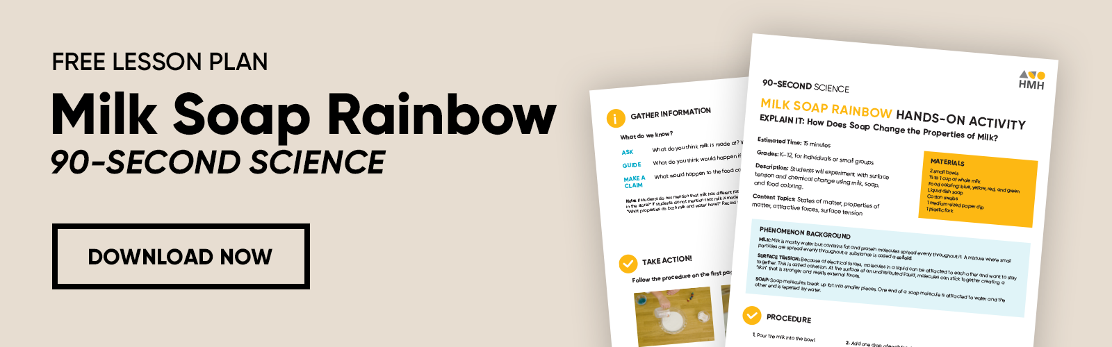 Using milk, food coloring, and dish soap, students experiment with surface tension and chemical change. This lesson is a great way to teach states of matter, properties of matter, attractive forces, and surface tension.