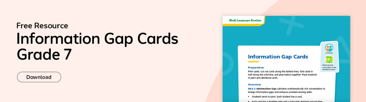Let’s take a look at what some language scaffolds look like in practice. HMH’s Into Math includes a variety of language routine activities, along with videos where peer coaches model the activities. One such activity uses Information Gap Cards. A Grade 4 sample is provided below, along with a corresponding video of the cards being used.