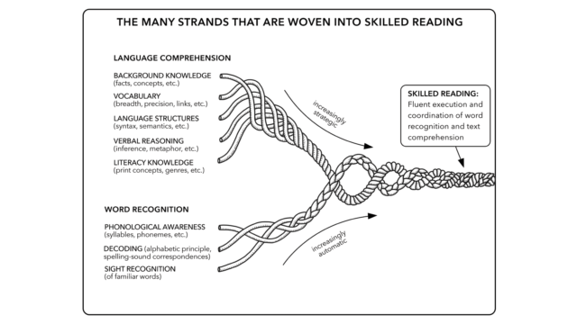 The image, used with permission for the Publisher, originally appeared in the following publication: Scarborough, H. S. (2001). Connecting early language and literacy to later reading (dis)abilitites. Evidence, theory, and practice. In S. Neuman & D. Dickenson (Eds.), Handbook of early literacy research (Vol. 1, pp 97–110). Gilford Press.