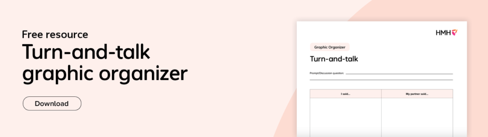 Think-pair-share works well when a deeper dive or public sharing is the goal. Turn and talk works better for rapid, inclusive engagement during instruction.