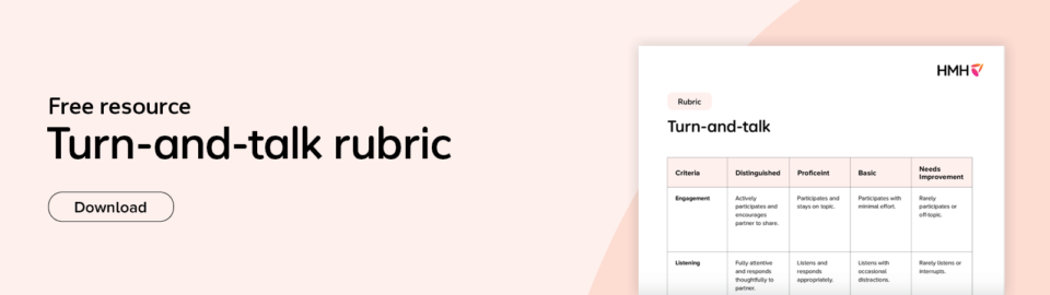 Using the turn and talk strategy in the classroom can help change that dynamic. Rather than relying on volunteers to answer, this technique ensures every student has a voice by engaging them in brief, purposeful peer conversations. Research shows that frequent opportunities for peer dialogue expand understanding, consolidate thinking, and support mastery of new learning.